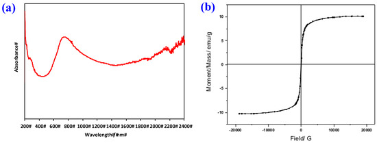Optical and magnetic properties of the SCB/magnetite composite photocatalyst (SCB:M (3:1)). (a) UV-Vis and (b) VSM.