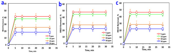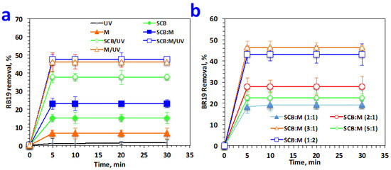 The preliminary Reactive blue 19 dye concentration in aqueous effluent influence on the RB19 removal efficacy by sorption/oxidation is exhibited in Figure 6 for the different systems, namely, SCB/H2O2/UV, M/H2O2/UV, and SCB:M/H2O2/UV systems. The preliminary H2O2 dosing was monitored at 400 mg/L and the magnetized SCB material dose of 40 mg/L at a pH value of 3.0, and the RB19 concentration ranged from 5 to 30 ppm. At a glance at Figure 6 for all systems, the highest RB19 oxidation efficacy was extended to a whole removal after 5 min, corresponding to the dye concentration of 5 ppm. However, an increase in the RB19 concentration resulted in a decrease in the mineralization efficacy.