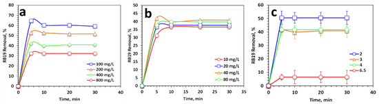 The percentage of RB19 removal from the aqueous effluent was calculated according to Equation (4). The effluent’s pH was monitored to a certain value, as essential, by a digital-type pH meter (model AD1030—Adwa, Szeged, Hungary).