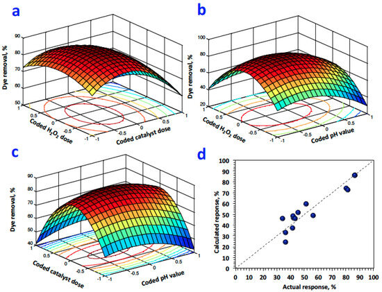 Additionally, a graphical illustration of the optimization exhibited in Figure 8b positions the area, which is the darker portion in the graph, for the optimal condition of the SCB:M /H2O2 system for RB19 removal. All the suggested parameters and their responses to the specific maximum and minimum limits of the predicted model region are suggestive and appropriate to the standard. Also, Figure 8c illustrates the relationship between the SCB:M reagent and the pH value. The suggested 3D and 2D plots indicate that the increased dose of the catalyst is increasing the oxidation of the dye. However, a low pH value results in an increased response. The curvature suggests the limits of expanding the dye’s oxidation with the variables.