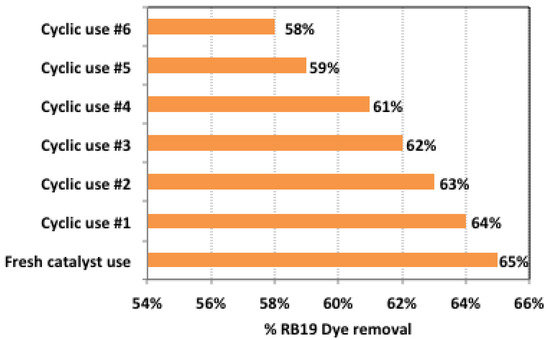 The magnetized SCB catalyst’s ability to be used again and again and to be stable enough to be recycled was a huge deal for its long-term use in this category of applications. Therefore, after use, the SCB:M catalyst was subjected to separation to be recovered for successive use after distilled water washing and oven-drying at 105 °C [22,40,41,42]. As illustrated in Figure 10, the catalyst showed good sustainability through a well-catalytic activity achieved through six cycles of reuse, with only a 7% reduction in its removal efficiency compared to the fresh one. Such catalysts’ magnetic properties are considered superior because of their long-term catalyst recyclability for successive use. Hence, their removal from the final effluent after treatment is an easy option via an external magnet. Consequently, such investigation confirmed SCB:M’s promise of sustainability in introducing them for industrial real wastewater treatment applications.
