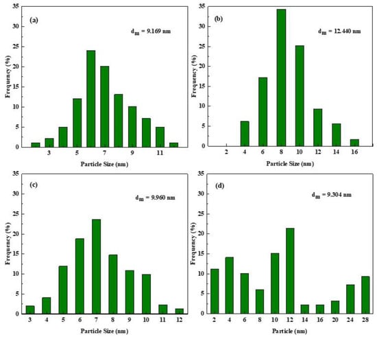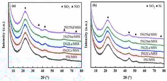 Figure 1b–d present the average Ni particle size of Ni with alkali (Mg), transition (Co), and rare-earth (Ce) metals at approximately 12.4, 10.0, and 9.3 nm, respectively. As shown in Figure 1a, among the Ni-based catalysts with La, Ni particles with a size of 6.0 nm exhibited the highest frequency, and the average Ni particle size was smaller, i.e., approximately 9.2 nm, indicating that the addition of an appropriate quantity of La can facilitate the dispersion of the active component Ni while simultaneously inhibiting the high-temperature aggregation of Ni particles. A homogeneous particle size distribution is beneficial for inhibiting catalyst sintering, thereby preventing a decrease in catalyst activity with an increase in particle size during the catalytic process. Furthermore, La facilitates the reducibility of NiO in the catalyst by weakening the interaction between NiO and Al2O3, thus making it easier to transition from the oxidized state to the active metal state. Song et al. [35] found that the binding energy (BE) of metallic Ni exhibited a negative shift from 852.7 to 852.3 eV in the presence of La, indicating that La donated electrons to Ni due to the electropositive nature of La. This resulted in Ni becoming more electron-rich. Furthermore, the higher capacity of La to bind with electrons than Al suggests that Ni atoms surrounded by La became more dominant than Ni atoms surrounded by Al, which resulted in a weakened interaction between NiO and Al2O3 due to the addition of La. This effect can help disperse the NiO particles and increase the accessibility of their surface active sites. Zhang et al. [36] observed the crystalline phase structure of Ni-based catalysts before and after reduction by X-ray diffraction (XRD), as shown in Figure 2. From Figure 2a, it can be observed that the intensity of the NiO characteristic peaks of Ni-based catalysts with lanthanide metal oxides is less pronounced than that of Ni/mesoporous silica spheres (MSSs). This indicates that lanthanum metal oxides prevented the NiO particles from agglomerating and thus improved the dispersion of the active components. From Figure 2b, it can be concluded that lanthanum metal oxides resulted in a greater number of Ni particles within the pores of Ni-based catalysts, which were less prone to oxidative reactions and reduced the possibility of forming carbon deposits [37].