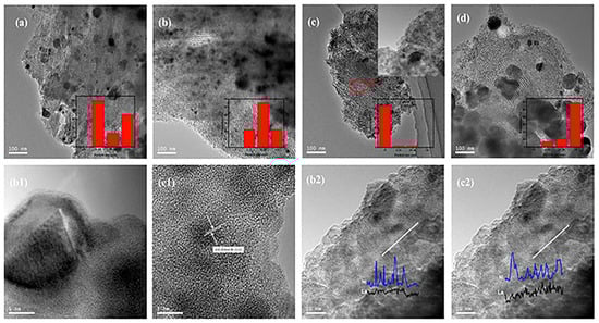 TEM and HRTEM images and line scanning profiles for the catalysts after H2 reduction: (a,d) xNi/SBA-15 (x = 1, 2); (b,b1,b2) Ni-La2O3/SBA-15 (wet impregnation method); (c,c1,c2) Ni-La2O3/SBA-15 (citrate complex method) [42].