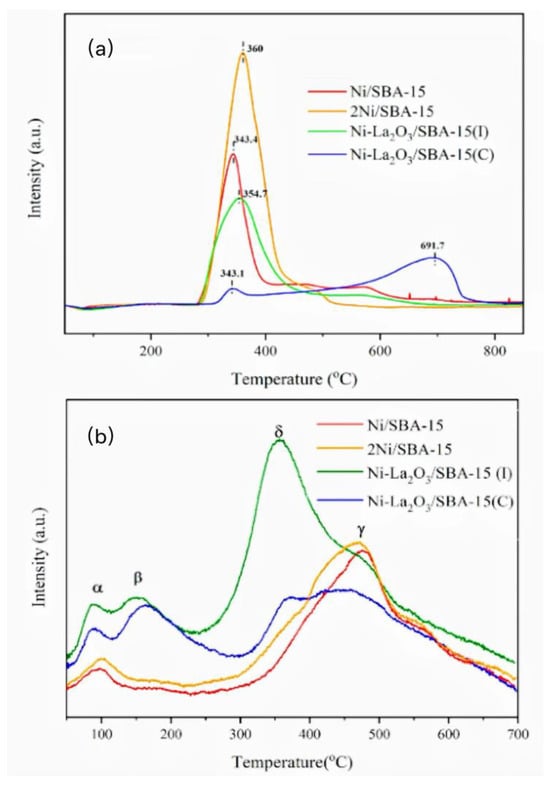 Figure 4 shows transmission electron microscopy (TEM) images of the catalysts after use. It can be clearly seen that the particle size of Ni on the surface of Ni/SBA-15 (Figure 4a) was much larger than that of reduced Ni (Figure 3a), which was mainly due to the aggregation of Ni. Conversely, the particle size of Ni in the Ni-La2O3/SBA-15(C) catalyst (Figure 4c) remained smaller than that of the other catalysts. Therefore, the even dispersion of Ni and the presence of La inhibited the growth of Ni particles, which improved the sintering resistance of the catalyst [48]. From the H2-TPR (Figure 5a), it can be seen that all catalysts exhibited a reduction peak at approximately 340 °C, which was attributed to the reduction of NiO combined with a relatively weak metal–support interaction. Ni-La2O3/SBA-15(C) showed a mild peak at 691.7 °C, which was mainly the reduction of NiO with a relatively strong metal−support interaction, ultimately generating smaller-sized and more active Ni particles, and thus delaying the agglomeration. It has been reported [49] that a high reduction temperature results in a stronger interaction between the metal and the carrier. The stronger the interaction between the metal and the carrier, the more difficult it is to reduce the catalyst and the better the dispersion of the metal on the catalyst surface will be [50]. It was also found that the reduction temperature of Ni-La2O3/SBA-15(I) was higher than that of Ni-SBA-15. This indicated that [51] La2O3 enhanced the interaction between the metal and the carrier and resisted sintering. Furthermore, the La promoter was found to increase the amount of H2 consumed for the reduction of NiO from 1250 μmol/g to 1596 μmol/g, which suggested that more Ni particles were reduced, which was favorable for improving the catalytic activity.