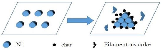- Cao, J.-P.; Ren, J.; Zhao, X.-Y.; Wei, X.-Y.; Takarada, T. Effect of atmosphere on carbon deposition of Ni/Al2O3 and Ni-loaded on lignite char during reforming of toluene as a biomass tar model compound. Fuel 2018, 217, 515–521. [Google Scholar] [CrossRef]