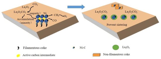 The use of La2O3 carriers that have been loaded with Ni metal can cause the catalyst to form a perovskite, in which Ni is well dispersed. This can relieve the degree of coverage of the active metal components by carbon deposition and reduce the deactivation rate of the catalyst [54]. Moreover, the La2O3 carrier is alkaline, which is beneficial for the adsorption of CO2 to form La2O2CO3 [81]. This consumes some of the carbon accumulated in the product while improving the catalyst activity (Figure 6 and Figure 7).