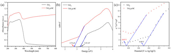 (a) UV–vis DRS spectra of TiO2 and TiO2/p-BC, (b) calculated corresponding bandgaps, and (c) corresponding Mott–Schottky curves.