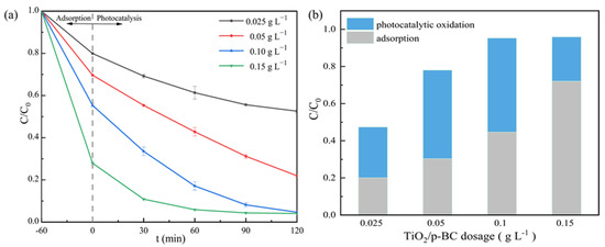 The effects of TiO2/p-BC on the removal of TC are shown in Figure 7a. As can be seen in Figure 7a, with an increase in composite dosage from 0.025 g L−1 to 0.1 g L−1, the removal efficiency increased from 47.4% to 96%. It thereafter increased with a further increase in the composite dosage (at a minor level). The removal of TC by the composite mainly included two processes: the adsorption of p-BC (dark stage) and the photocatalytic degradation of TiO2 (light stage). Figure 7b shows the contribution of adsorption and photocatalytic degradation to the TC removal for different composite dosages. The results showed that the removal of TC by the removal of adsorption increased with an increase in composite dosage. With the dosage increase from 0.025 g L−1 to 0.1 g L−1, the removal of TC by photocatalytic degradation increased from 27.3% to 50.7%. For a further increase in the composite dosage, the removal of photocatalytic degradation diminished further. The reason for this observation was that the high composite concentration blocked the penetration of light, thereby reducing the utilization of light [40]. Therefore, the composite dosage was selected as 0.1 g L−1. At this dosage, the composite showed a high adsorption capacity and photocatalytic removal of TC and also ensured a high total removal efficiency.