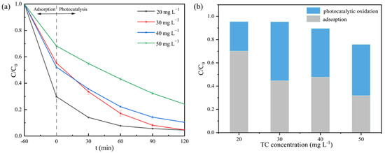 The effects of the initial concentration on the removal of TC are shown in Figure 8a. With the increase in initial TC concentration from 20 mg L−1 to 50 mg −1, the removal efficiency decreased from 95.5% to 75.8%. Also, Figure 8b shows the contribution of adsorption and photocatalytic degradation to the TC removal under different initial concentrations. The results showed that adsorption played a key role in the removal of TC at the initial concentration of 20 mg L−1, while the photocatalytic degradation contributed with a lesser degree to the removal. When the initial concentration was 30 mg L−1, the composite had considerable adsorption and photocatalytic removal effect on TC, and the total removal efficiency was larger than 95%. Thereafter, with an increase in the initial concentration, the total removal efficiency of TC was less than 90%. One of the reasons was that the adsorption site of the composite was unchanged, and the increase in TC concentration led to a decrease in adsorption removal efficiency. In addition, the increase in TC concentration reduced the penetration of light and prevented light from reaching the surface of the composite, thereby reducing the utilization of light [41].