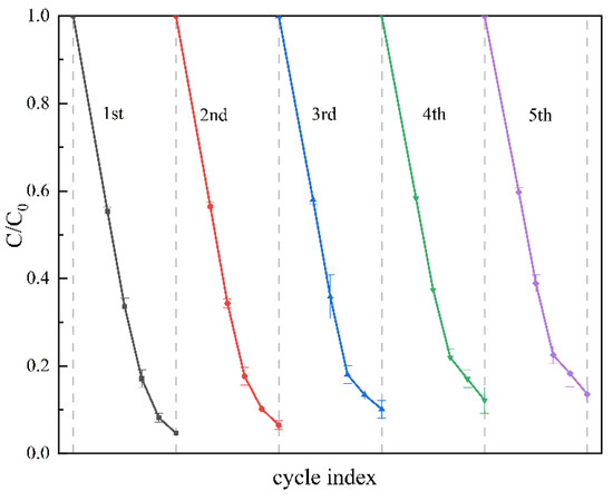 The reusability of the photocatalyst is related to the economic feasibility of the photocatalytic process, and it can also indicate the stability of the photocatalyst. In the present study, the reusability of TiO2/p-BC has been evaluated by five successive photocatalysis experiments for the removal of TC. As can be seen in Figure 9, the removal efficiencies were 95.3%, 93.5%, 89.9%, 87.8%, and 86.5% after five cycles. Although the removal efficiency decreased slightly after each cycle, the removal efficiency of TC by TiO2/p-BC remained above 86% after five cycles, indicating that it had excellent reusability and stability. The decrease in removal efficiency could be attributed to the accumulation of intermediates on the TiO2/p-BC surface [30,42] and the detachment of a small amount of TiO2 [43].