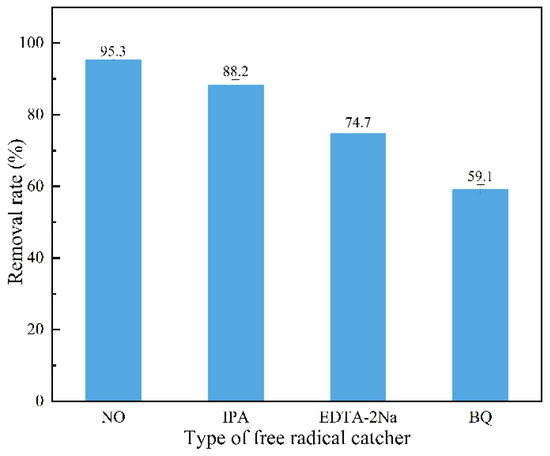 To explore the photocatalytic degradation mechanism of TC by TiO2/p-BC, an active species capturing experiment was designed. BQ, IPA, and EDTA-2Na were then added to the reaction system as quenchers for ·O2−, ·OH, and h+, respectively. The results (Figure 11) showed that the removal efficiency of TC decreased from 95.3% to 59.1%, 88.2%, and 74.7% in the presence of BQ, IPA, and EDTA-2Na, respectively. This indicated that ·O2− made an important contribution to the photocatalytic degradation of TC, which was not the case for ·OH and h+.