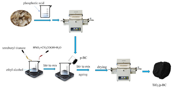 The TiO2/p-BC composite was prepared through a modified sol–gel method [32]. The specific steps are as follows: (1) 6 mL of tetrabutyl titanate was added dropwise to 16 mL of anhydrous ethanol. Thereafter, the solution was stirred for 20 min to obtain a homogeneous solution, which was labeled as A. (2) Ten mL of anhydrous ethanol, 1.3 mL of deionized water, 0.7 mL of glacial acetic acid, and 0.7 mL of nitric acid (40 wt.%) were mixed into a homogeneous solution, and was labeled as B. (3) B was added dropwise to the A solution to obtain a mixed solution. Two grams of p-BC were added to this solution and stirred for 4 h before a static aging for 48 h. After 48 h, the gel was dried in an oven at 80 °C for 24 h and ground through a 100 mesh sieve. Finally, the solid was pyrolyzed in a furnace at 500 °C for 2 h, with a slow rate of 5 °C min−1 in an N2 atmosphere. Thereby, the TiO2/p-BC composite was obtained. The preparation process of the TiO2/p-BC composite is displayed in Figure 13. Pure TiO2 was prepared by the same method as above, except for the omission of p-BC.