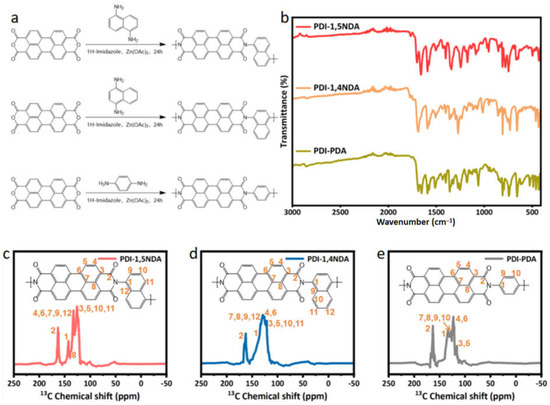 Structural characterization of the PDI samples: (a) The synthesis route of the three PDI. (b) FT-IR spectra of PDI. (c–e) Solid-state 13C-NMR spectra of PDI-1,5NDA; PDI-1,4NDA; and PDI-PDA samples.