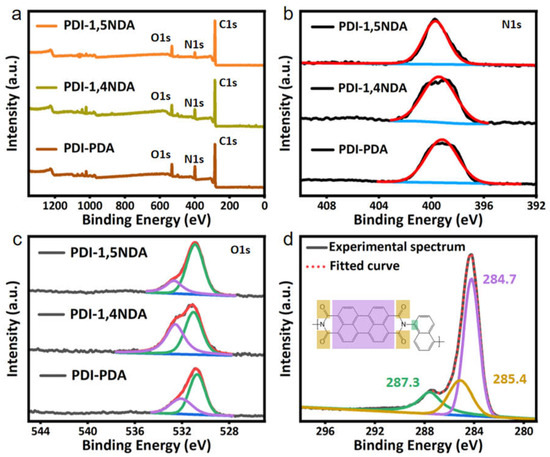 XPS spectra of the PDI samples: (a) XPS survey profile. (b) N1s high-resolution XPS profile. Black lines are the experimental spectra of PDI samples. Red lines are fitted curve. Blue lines are the background. (c) O1s high-resolution XPS profile. Black lines are the experimental spectra of PDI samples. Red lines are fitted curve. Green lines and purple lines are fitted peak. Blue lines are the background. (d) C1s high-resolution XPS profile.