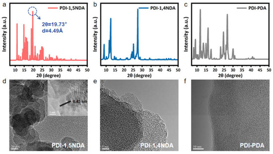 The morphologies of the PDI were subsequently characterized by transmission electronic microscopy (TEM). As presented in Figure 3d, the highly crystalline PDI-1,5NDA shows the typical nanosheet morphology. The high-resolution transmission electronic microscopy (HRTEM) results for PDI-1,5NDA present clear lattice fringes with a lattice spacing of 0.449 nm, which perfectly matches the peak at 19.73° in the PXRD pattern (Figure 3a). This result further proves the high level of crystallinity of PDI-1,5NDA. Theoretically, the high level of crystallinity and good π-π stacking would lead to the regular overlap of delocalized π electrons in multiple layers, and the inter-layer electron transfer of PDI-1,5NDA can be greatly promoted through it, by means of which the sample would obtain relatively good catalytic activity. PDI-1,4NDA and PDI-PDA also show multi-layer nanosheet morphology in the images from TEM, but it is difficult to observe their lattice fringes (Figure 3e,f), indicating that their levels of crystallinity might be lower than that of the PDI-1,5NDA.