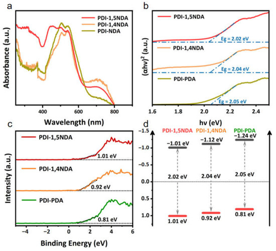 In general, the photocatalytic activity of a semiconductor photocatalyst is largely determined by the photon absorption process and the efficient separation and transportation process of the photogenerated charge. The light harvest capacity and band position of the photocatalyst determine the thermodynamically feasible photocatalytic reaction. The light-absorption of the three PDI samples was tested by UV-Vis diffuse reflectance spectroscopy (UV-DRS). Three PDI with different crystallinity showed similar good visible-light capture abilities (Figure 4a). All of the prepared materials were able to achieve full spectral absorption in the visible region. Notably, both the PDI-1,5NDA sample and the PDI-1,4NDA sample exhibited significant light-absorption in the range of 600–800 nm, which could be ascribed to the large conjugate systems. The band gaps of PDI with different levels of crystallinity are calculated by constructing Tauc Plots (Figure 4b). Meanwhile, combining the results of XPS valence band spectra and Mott–Schottky measurements, the energy band positions of three kinds of PDI are determined. As shown in the XPS valence band spectra (Figure 4c), the maximum valence band values (VB max) of PDI-1,5NDA; PDI-1,4NDA; and PDI-PDA are found to be 1.01eV, 0.92 eV, and 0.81 eV, respectively. Thereafter, the energy band structures can be obtained, a process which is shown schematically in Figure 4d. By using the band gap energy, the conduction band (CB) positions were calculated to be −1.01 eV, −1.12 eV, and −1.24 eV, respectively.
