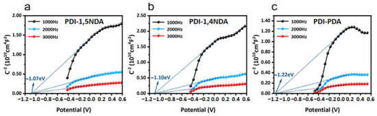 Mott–Schottky(MS) plots of PDI samples at different frequencies: (a) MS plots of PDI-1,5NDA. (b) MS plots of PDI-1,4NDA. (c) MS plots of PDI-PDA.
