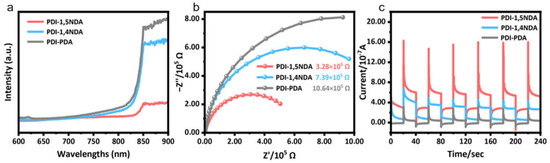 The separation and migration of photogenerated carriers are the decisive kinetic factors for the photocatalytic reaction, and the strong internal electric field provides a driving force for the process of charge separation and transportation. The photoluminescence spectra at 570 nm excitation wavelength (Figure 6a) showed that, compared to the PDI-1,4NDA and PDI-PDA samples with lower crystallinity, the PDI-1,5NDA, with a high level of crystallinity, tends to have lower photoluminescence intensity and a lower fluorescence response, which confirms that the recombination degree of its photogenerated carriers is lower; these experimental results indicated that PDI-1,5NDA has the highest photoquantum efficiency among the three materials.