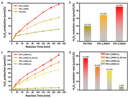 Photocatalytic efficiency of the PDI samples: (a) Efficiency of photocatalytic decomposition of water to produce H2O2. (b) Production rate of H2O2 of the three PDI. (c) Efficiency of photocatalytic decomposition of water to produce H2O2 by PDI-1,5NDA under different experimental conditions. (d) Production rate of H2O2 of PDI-1,5NDA under different experimental conditions.
