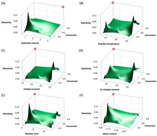 Surface diagram for selectivity and conversion in decimal value (0–1): (A) substrate amount (0.5–4 mL), (B) reaction temperature (30–80 °C), (C) catalyst amount (10–50 mg), (D) co-catalyst amount (10–60 mg), (E) reaction time (0.5–24 h), and (F) water content (0.001–0.5 mL). Purple = target optimal point for the reaction.