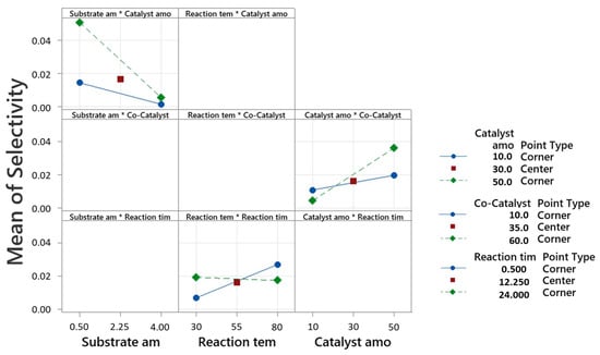Interaction plot for selectivity, in decimal value (0–1), of the optimization by fitted means.
