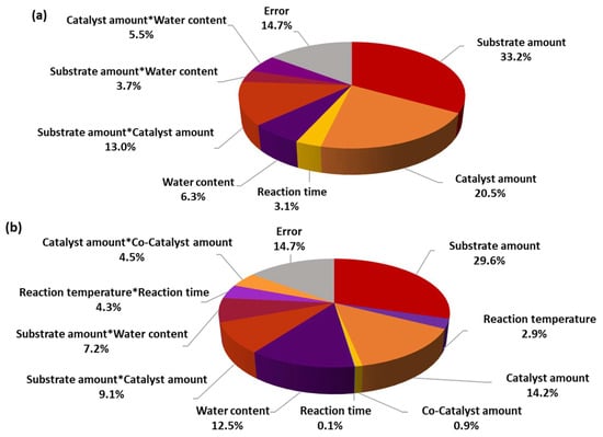 Pie charts of analysis of variance by adjusted means for the seven-factor DoE of (a) conversion and (b) selectivity.