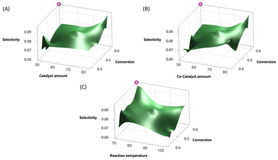 Surface diagram for selectivity and conversion in decimal value (0–1): (A) catalyst amount (50–80 mg), (B) co-catalyst amount (50–80 mg), and (C) reaction temperature (70–100 °C). Purple = target optimal point for the reaction.
