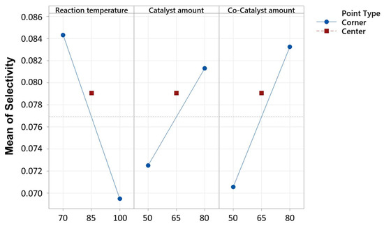 A decrease in the reaction temperature (−0.01486) corresponded to a decrease in the response, while increases in the catalyst amount (0.00884) and co-catalyst amount (0.01273) led to increases in the response, as seen in Figure 6 and Figure 7. However, the center point did not exhibit a statistically significant effect on the response variable, and thus the linear behavior. The model explained 94.05% of the variance in the response.
