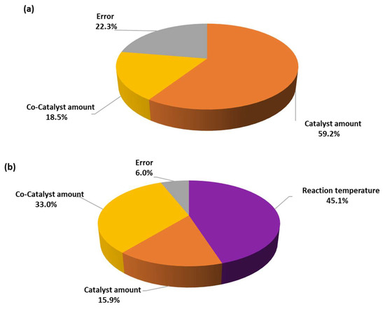 Pie charts of analysis of variance by adjusted means for the optimization of (a) conversion and (b) selectivity.