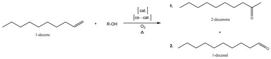The new synthesis route to n-decanal offers several advantages over the conventional petrochemical process. It utilizes renewable resources, such as 1-decene. The market size of 1-decene is estimated to range between 500,000 and 700,000 tons per year, as reported by Kohl [31]. Ethenolysis, a chemical process employed by Verbio GmbH to produce 1-decene, involves the degradation of terminal olefins and can be characterized as a type of cross-metathesis. The new route to n-decanal utilizing green 1-decene employs the environmentally friendly Tsuji–Wacker oxidation method, potentially utilizing green oxygen obtained from water splitting, and drastically reduces the amount of reaction steps needed. This approach reduces reliance on fossil resources, minimizes unwanted by-products, and addresses environmental and climate concerns associated with traditional petrochemical synthesis routes. The Wacker oxidation of terminal alkenes typically leads to the formation of methyl ketones (Markovnikov product (1)) with high regioselectivity, unless the substrate contains coordinating groups that can direct the palladium to the inner carbon atom [32], or a suitable ligand on the palladium catalyst, minimizing the transition state activation energy of the anti-Markovnikov reaction. In this study, the objective is to redirect the regioselectivity of the reaction toward the aldehyde (anti-Markovnikov product (2)) by optimizing the reaction parameters using a predetermined homogeneous catalyst. The two possible products of such a catalyzed Wacker-type oxidation [33] are shown in Scheme 1.