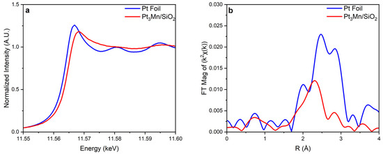 Insitu XAS experiments were conducted 10-BM-B beamline at the Advanced Photon Source (APS) of Argonne National Lab (ANL, Lemont, IL, USA). A Pt foil was measured to calibrate the energy and compare it with the synthesized Pt alloy. Both Pt foil and Pt alloy samples were measured at the Pt LIII edge (11,564 eV), from 250 eV prior to the edge to 1000 eV after the edge. Samples were pre-reduced in the 3% H2/He for 30 min and then scanned under ambient conditions. WinXAS 4.0 was used to analyze the data to determine the bond distance, edge energy shift, and coordination number from the X-ray absorption near edge structure (XANES) and extended X-ray absorption fine structure (EXAFS) using standard procedures. The analyzed data were used to confirm the formation of the Pt3Mn alloy.