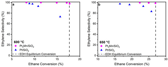 Figure 11). At 650 °C, the ethane–ethylene equilibrium increases to 28% and the ethane conversion can be increased above about 35% (