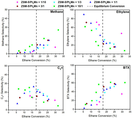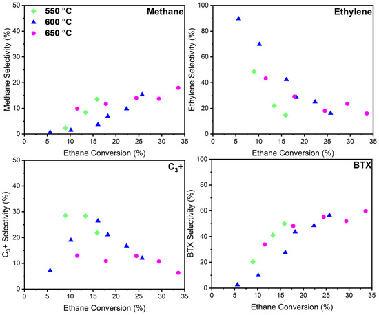 Figure 7). As discussed above, with increasing ethane conversions, the BTX selectivity decreases slightly due to increased benzene and decreased xylene selectivities (