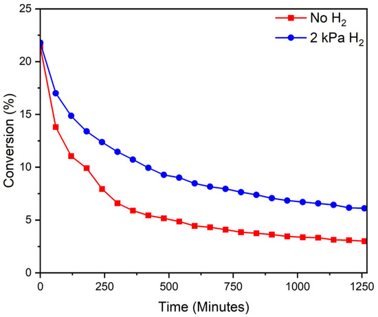 2 had little effect on product selectivity or conversion; however, they marginally improved deactivation. Higher H