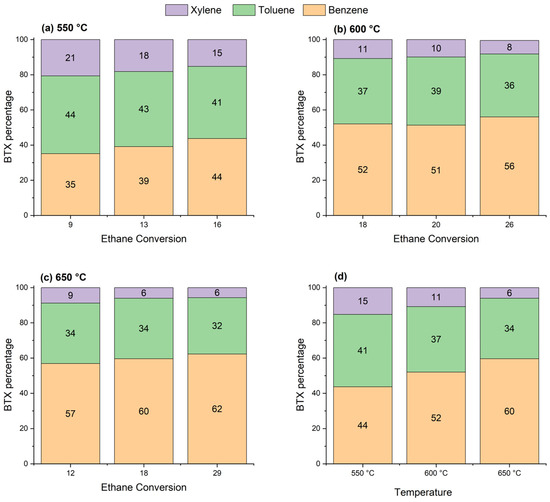 Figure 7). At this temperature, the benzene selectivity is high with little xylene, and the BTX yield is less affected by increasing ethane conversion. Reaction temperatures from about 600 to 650 °C appear to be optimum for higher BTX selectivity and conversion.