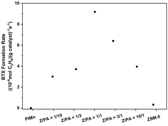 For catalysts with lower amounts of ZSM-5, e.g., weight ratios of 1/3 and 1/10, the rates were also lower, about one-third that of the 1/1 catalyst. Catalysts with too little ZSM-5 were unable to convert ethylene to BTX and thus had low BTX rates. Like all bifunctional catalysts and reactions, the rate of either of the two reactions, e.g., alkane dehydrogenation or Brønsted acid reactions, can be rate-limiting, and the optimum composition will depend on the relative rates of the two rate-limiting steps.