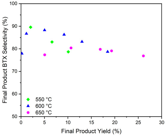 22]. The BTX selectivity also decreases slightly as the final product yield increases above about 15%. At this yield, there are few reaction intermediates (