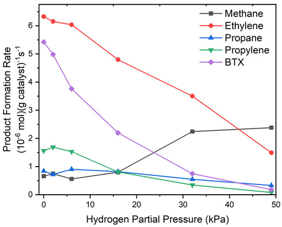 2 partial pressures. For the products produced by dehydrogenation, e.g., ethylene and BTX, the rates decrease with an increasing H