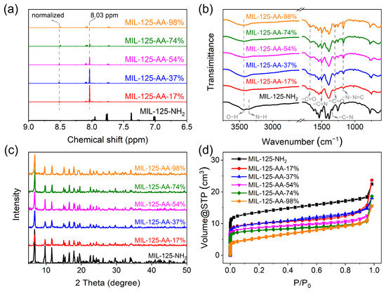 Confirmation of the physicochemical structure of MIL-125-AA-x%. (a) H-NMR spectrum after digestion in DMSO-d6; (b) ATR-FTIR spectra; (c) XRD spectra; (d) nitrogen adsorption–desorption curves.