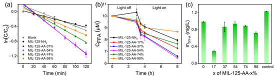 Photocatalytic performance of MIL-125-AA-x% for different substrates. (a) AO7; (b) furfuryl alcohol (FFA); (c) Microcystis aeruginosa.