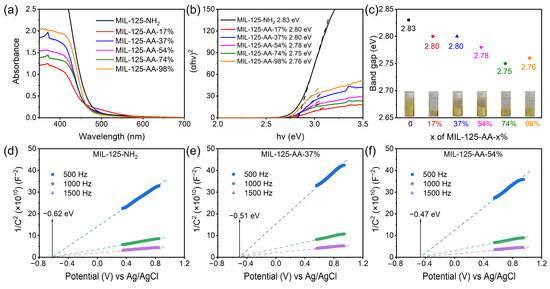 Band structure of MIL-125-AA-x%. (a) UV–visible diffuse reflectance spectrum; (b) Tauc-plot; (c) Band gap; (d–f) Mott–Schottky curve of MIL-125-NH2, MIL-125-AA-37%, and MIL-125-AA-54%. (The dotted line was used to determine the intersection of the fitted line with the horizontal coordinate).