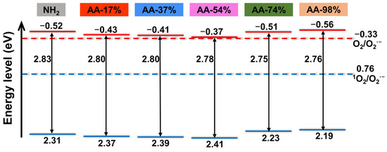 MIL-125-NH2 was identified as a typical n-type semiconductor [33], and the Mott–Schottky curve of MIL-125-AA-x% exhibited similarities to it, leading to further exploration of its flat band potential. In n-type semiconductors, the potential at the bottom of the conduction band is typically 0.1 eV lower than the flat band potential [34]. Analysis of Figure 4 and Figure S6 revealed that with the exception of MIL-125-AA-98%, the conduction band bottoms of MIL-125-AA-x% materials with varying AA modifications were all positioned higher than that of MIL-125-NH2 (−0.52 V vs. NHE). Notably, the most significant enhancements were observed in MIL-125-AA-54% (−0.37 V vs. NHE) and MIL-125-AA-37% (−0.41 V vs. NHE). When considering this in conjunction with the band gap [35], the material’s band structure of MIL-125-Xs (Xs represents the NH2 ligand or AA-x% ligand) is illustrated in Figure 4.