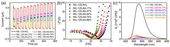 Photoelectric properties and fluorescence response of MIL-125-AA-x%. (a) Photocurrent; (b) electrochemical impedance spectrum; (c) fluorescence emission spectrum.