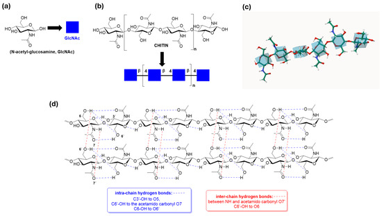 (a) Chemical structure of N-acetyl glucosamine (GlcNAc) and its schematic representation according to symbol nomenclature for graphical representations of glycans (SNFG [40,41]). (b) Structure of a linear polysaccharide composed by a repetition of subunits of GlcNAc connected by (β1→4) glycosidic bonds. (c) Three-dimensional representation of a GlcNAc hexamer, using 3D symbol nomenclature for glycans (3D-SNFG) [42]. (d) Intra- (blue) and inter-chain (red) hydrogen bonding in α-chitin.