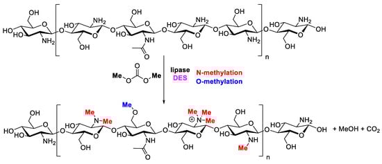 Yet, the use of DESs and enzymes has been reported for the quaternization of chitosan. This process involves the introduction of a quaternary ammonium moiety onto or adjacent to the chitosan backbone through reactions with primary amino and hydroxyl groups under various experimental conditions [199,200]. By incorporating a quaternary moiety into chitosan, the resultant polymer gains permanent cationic charges on its backbone, leading to enhancements in properties like water solubility, antimicrobial activity, mucoadhesiveness, and permeability [201,202]. This modification enables multiple applications, primarily in the biomedical and pharmaceutical fields [203,204]. Traditional forms of quaternized chitosan, such as N,N,N-trimethyl chitosan (TMC) and N-[(2-hydroxy-3-trimethyl ammonium) propyl] chitosan (HTCC), have been widely used, alongside newer variants incorporating pyridinium or phosphonium salts [199]. A significant challenge of this chemical modification lies in its low selectivity, resulting in a mixture of O- and N-methylated products, as well as the non-desired breaking of the chitosan polymer due to the stringent conditions required (organic solvents such as N-methyl-2-pyrrolidone (NMP), dimethyl sulfate (DMS), or dimethylformamide (DMF); iodomethane as a methylating agent and NaOH as a base), consequently reducing the molecular weight of the final product. Thus, two sequential publications by Dandekar, Jain, and coworkers [205,206] reported the use of lipases from Burkholderia cepacia or Candida rugosa for the transformation of chitosan into the desired methylated products in DES/water mixtures using dimethyl carbonate (DMC) as a sustainable methylating agent (without the need for a base additive) and at lower process temperatures compared to the chemical synthesis (Figure 4).
