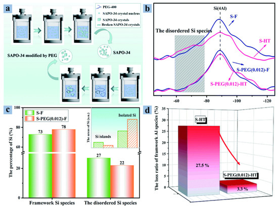 (a) The proposed crystallization process of intact SAPO-34 crystals in the presence of a PEG modifier; (b) 29Si solid NMR spectra of S-F, S-HT, S-PEG(0.012)-F, and S-PEG(0.012)-HT; (c) quantified results of Si species on S-F and S-PEG(0.012)-F; (d) the loss of framework Al species on S-HT and S-PEG(0.012)-HT. (Reprinted with permission from [42]. Copyright: 2021, Royal Society of Chemistry, London, UK).