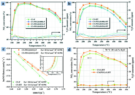 (a) The catalytic performance of NH3-SCR of NOx over (b) fresh and (c) hydrothermally treated SAPO-34 catalysts; (c) Arrhenius plots of CS-F/HT and CS-PEG(0.012)-F/HT; (d) the NH3−SCR performance and amount of N2O over the low-temperature hydrothermally aged samples. (Reprinted with permission from [42]. Copyright: 2021, Royal Society of Chemistry, London, UK).