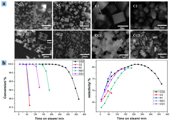 (a) SEM images of different samples and (b) the catalytic activity and selectivity variations with time on stream over various SAPO-34 catalysts in MTO reaction. Reaction conditions: WHSV = 2.0 h−1, T = 673 K, and catalyst weight = 300 mg. (Reprinted with permission from [53]. Copyright: 2021, Royal Society of Chemistry, London, UK).