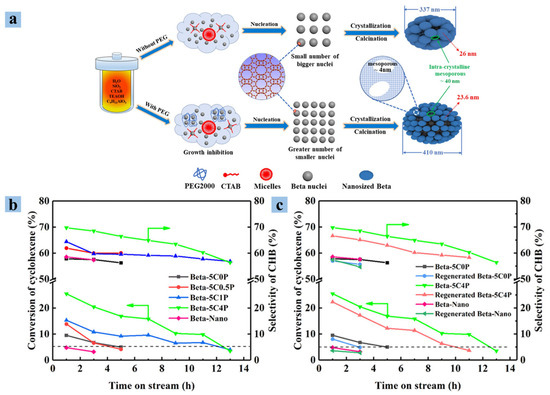 The obtained β-zeolite nanocrystal aggregates (β-5CxP) showed outstanding catalytic activity and stability under the harsh reaction conditions for the alkylation of benzene and cyclohexene. As shown in Figure 4b, the lifetime of the optimized β-zeolite aggregates (β-5C4P) could be extended by 4.3 times in comparison with that of the commercial nanosized β-zeolite (β-Nano). The authors proposed that the additional PEGs play the role of crystal growth inhibitors that can decrease the size of nanocrystals and, therefore, may effectively increase the accessible Brønsted acid sites and enhance the diffusion properties of the resultant β-zeolite nanocrystal aggregates. In addition, the resulting β-5C4P also exhibited extraordinary regeneration performance, which is a crucial factor for industrial applications with desirable stability (Figure 4c).