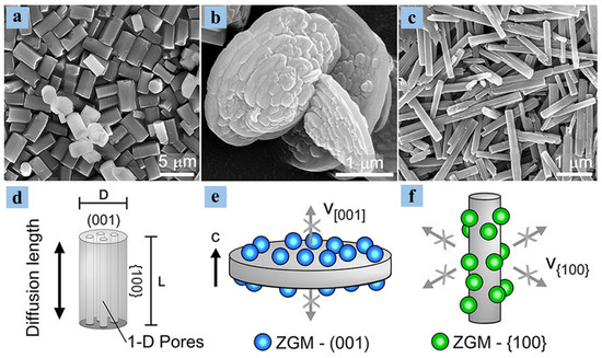 SEM images of zeolite L crystals synthesized under the following conditions: (a) control (absence of ZGMs); (b) butylamine, A4 (10 wt%); and (c) PDDA (2.1 wt%). The schematic in (d) illustrates that the path length for sorbate diffusion in zeolite LTL channels is proportional to the [001] length (L), while sorbate access to pore openings is dependent on the [001] surface area or diameter (D). (e) ZGMs that preferentially bind to the [001] surface reduce the diffusion path length along the c-axis. (f) ZGM binding to [100] surfaces increases the LTL crystal aspect ratio, L/D. (Reprinted with permission from [21]. (Copyright: 2013, American Chemical Society, Washington, DC, USA).